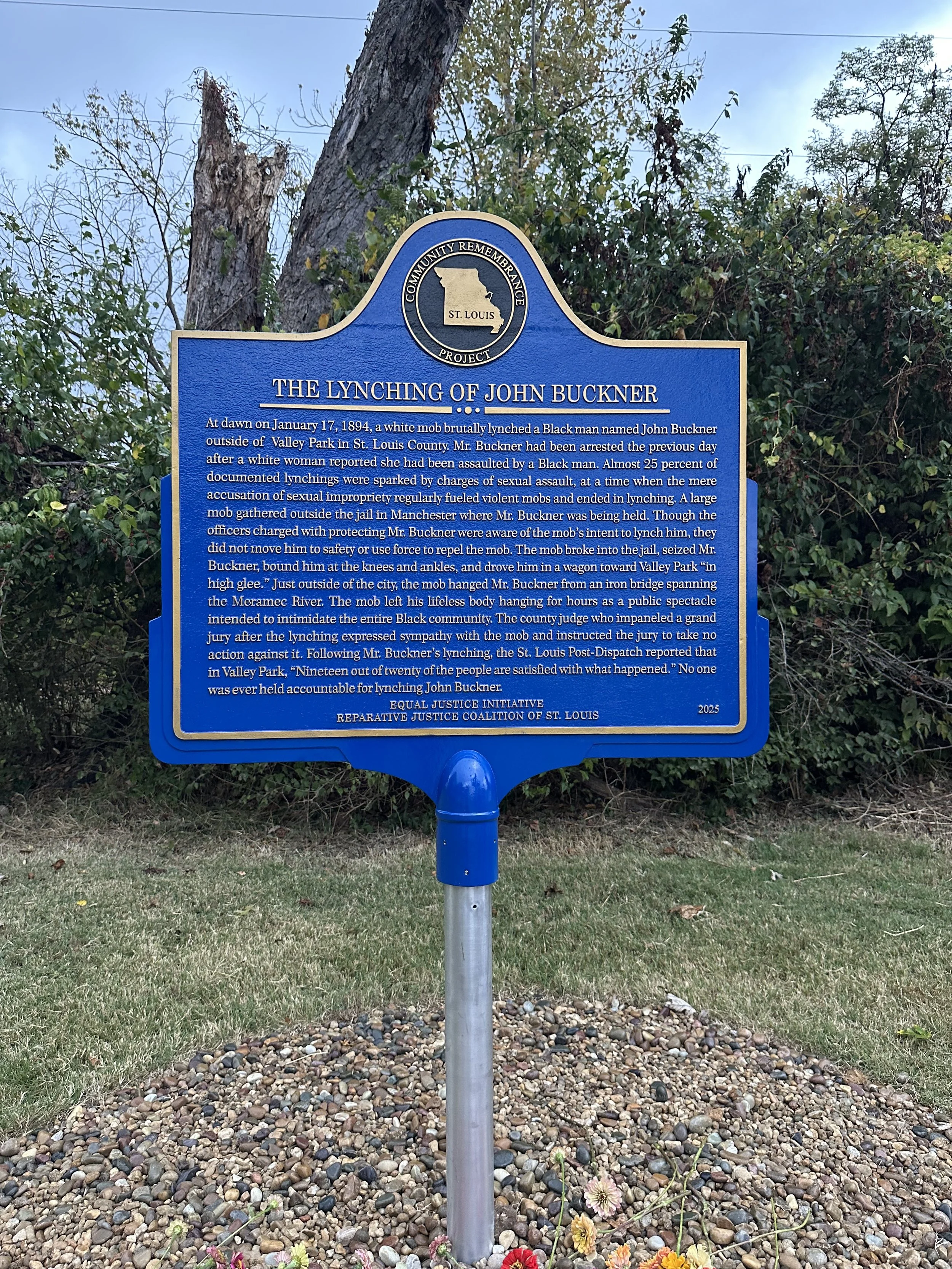 In October 2025 RJCSTL unveiled this historical marker acknowledging the lynching of John Buckner near the site where it happened: where the Route 141 bridge crosses the Meramec River.